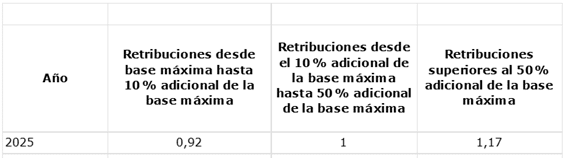 Per a això, s’ha establert amb efectes des de l’1 de gener 2025, una quota consistent en l’aplicació d’uns percentatges fixos de cotització que s’aplicaran a l’excés de la base de cotització màxima. Aquest percentatge s’aplicarà de manera gradual anualment des de 2025 fins a l’any 2045. La cotització serà a càrrec d’empresa i de treballador.